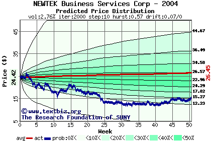 The high to date and low to date prices of the stock plotted against a random walk model for 2004 (what's this?).