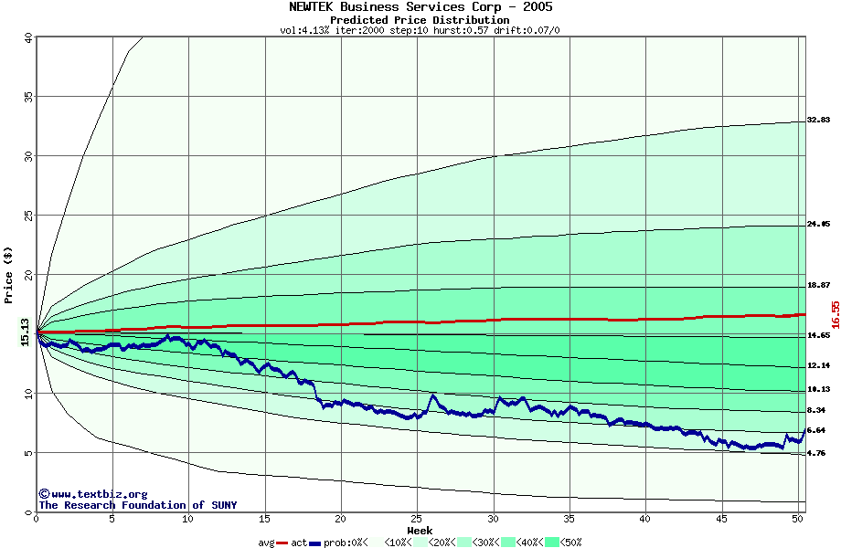 The following graph plots the year-to-date performance of the stock for 2005 compared to the probability calculated by a random walk model.