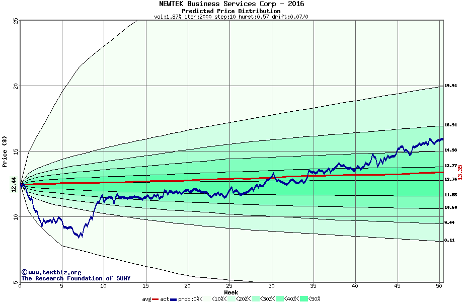 The high to date and low to date prices of the stock plotted against a random walk model for 2016 (what's this?).