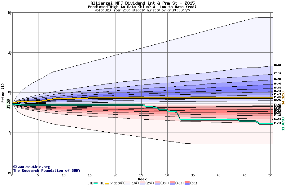 The high to date and low to date prices of the stock plotted against a random walk model for 2015 (what's this?).