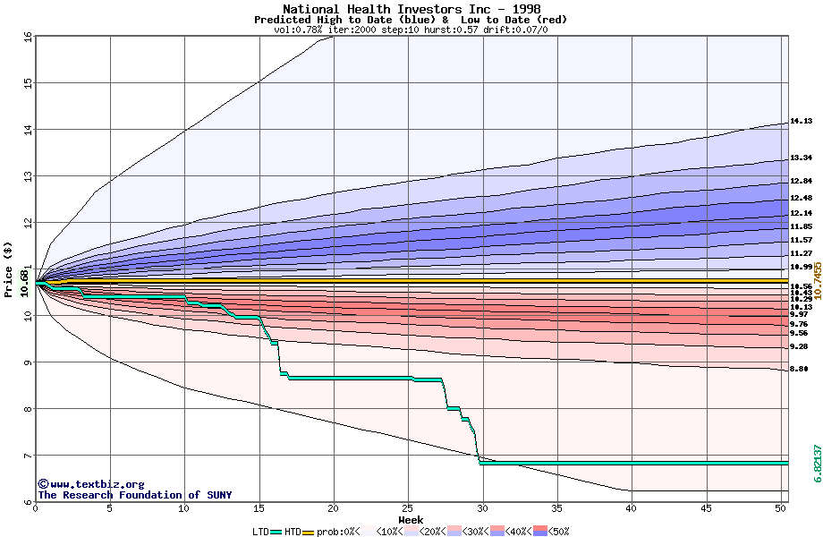 The high to date and low to date prices of the stock plotted against a random walk model for 1998 (what's this?).