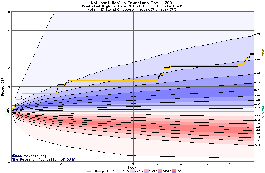 The high to date and low to date prices of the stock plotted against a random walk model for 2001 (what's this?).