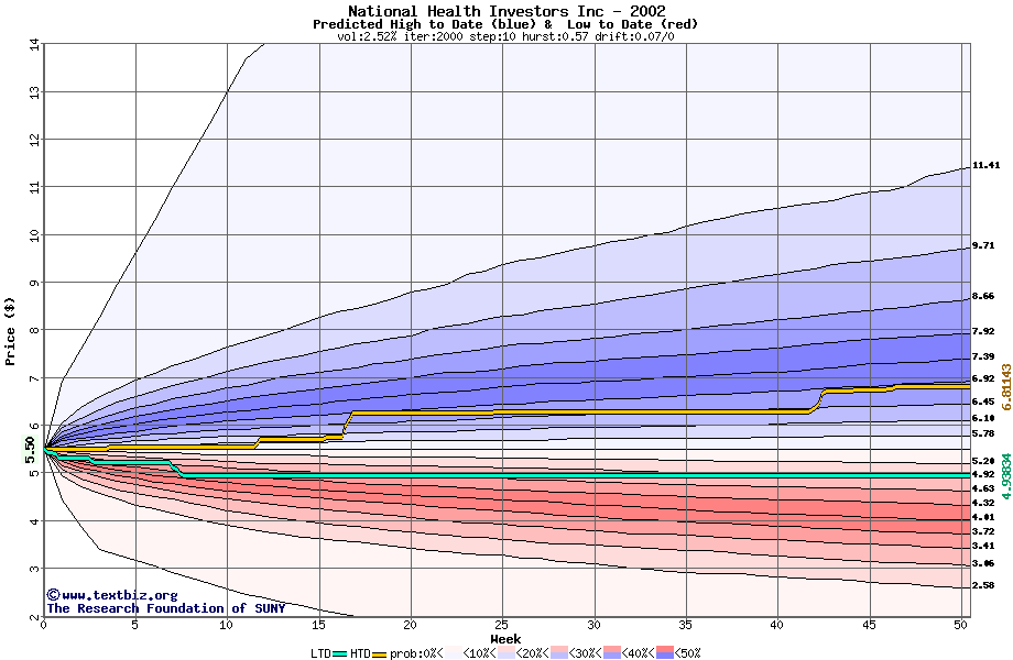 The high to date and low to date prices of the stock plotted against a random walk model for 2002 (what's this?).