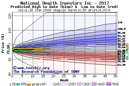 The high to date and low to date prices of the stock plotted against a random walk model for 2017 (what's this?).