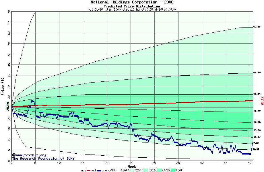 The following graph plots the year-to-date performance of the stock for 2008 compared to the probability calculated by a random walk model.