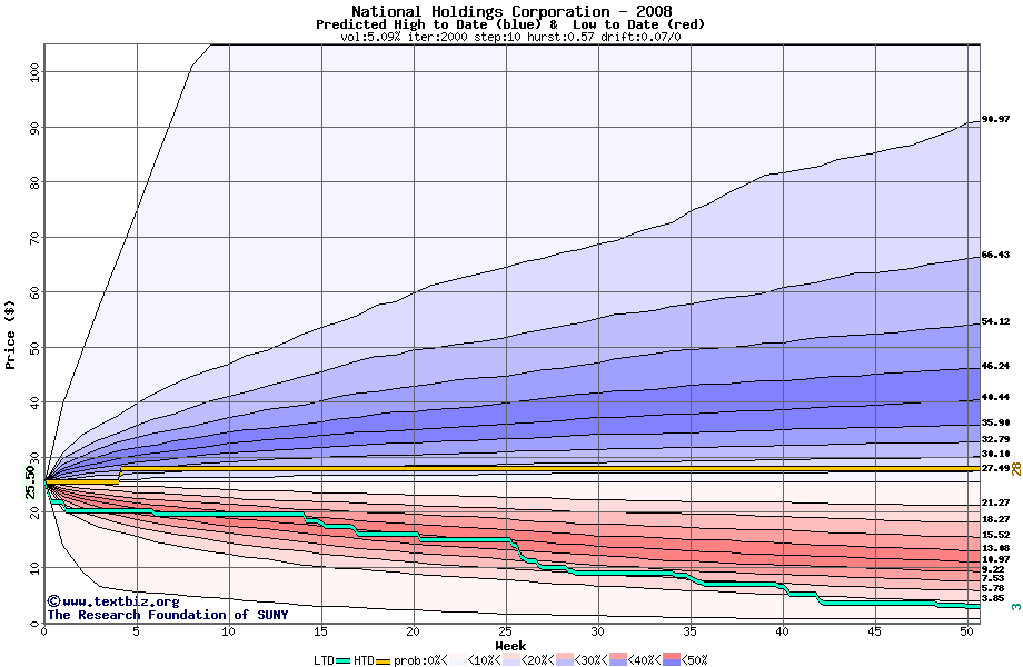 The high to date and low to date prices of the stock plotted against a random walk model for 2008 (what's this?).