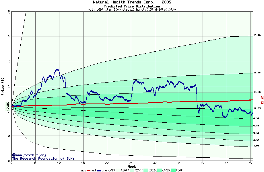 The following graph plots the year-to-date performance of the stock for 2005 compared to the probability calculated by a random walk model.
