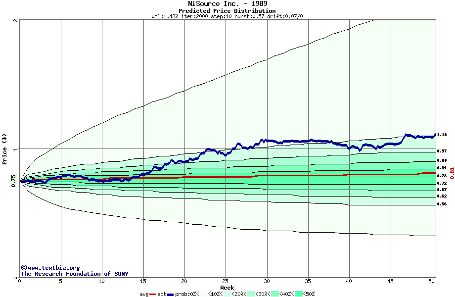 The following graph plots the year-to-date performance of the stock for 1989 compared to the probability calculated by a random walk model.