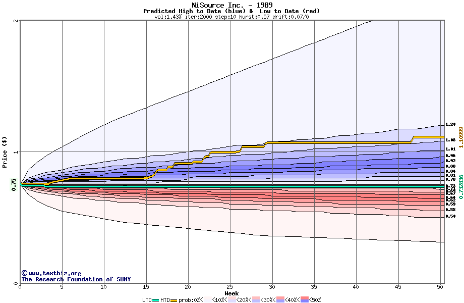 The high to date and low to date prices of the stock plotted against a random walk model for 1989 (what's this?).
