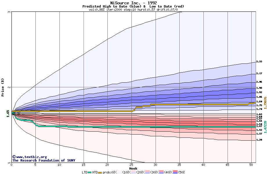 The high to date and low to date prices of the stock plotted against a random walk model for 1992 (what's this?).