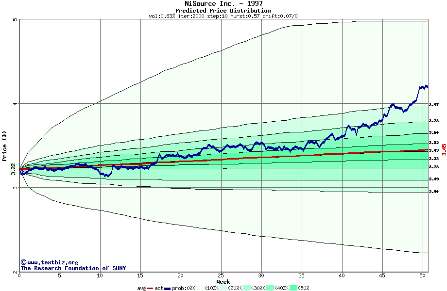 The following graph plots the year-to-date performance of the stock for 1997 compared to the probability calculated by a random walk model.