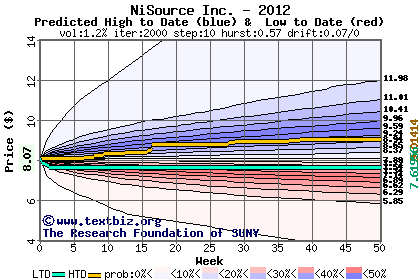 The high to date and low to date prices of the stock plotted against a random walk model for 2012 (what's this?).