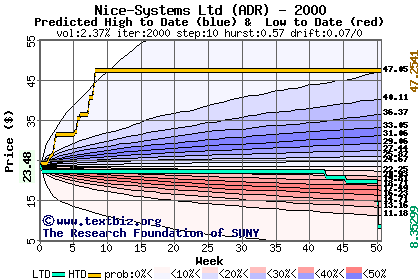 The high to date and low to date prices of the stock plotted against a random walk model for 2000 (what's this?).