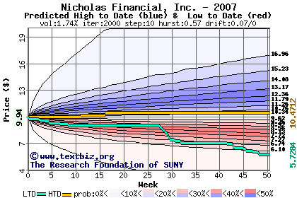 The high to date and low to date prices of the stock plotted against a random walk model for 2007 (what's this?).