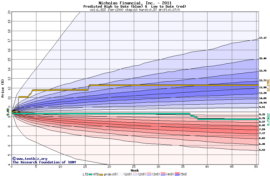 The high to date and low to date prices of the stock plotted against a random walk model for 2011 (what's this?).