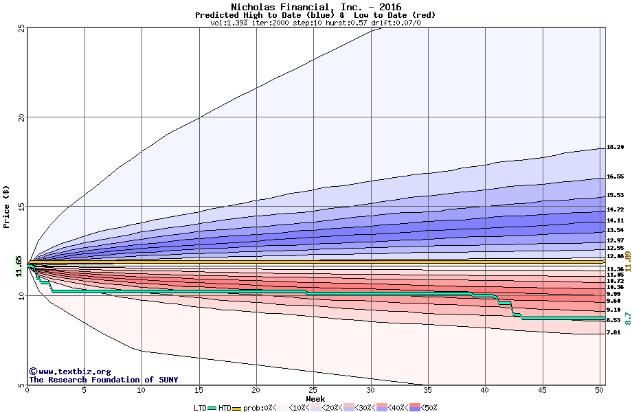 The high to date and low to date prices of the stock plotted against a random walk model for 2016 (what's this?).