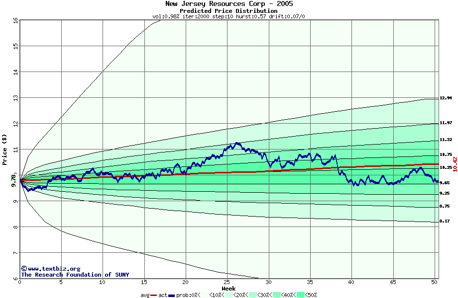 The following graph plots the year-to-date performance of the stock for 2005 compared to the probability calculated by a random walk model.
