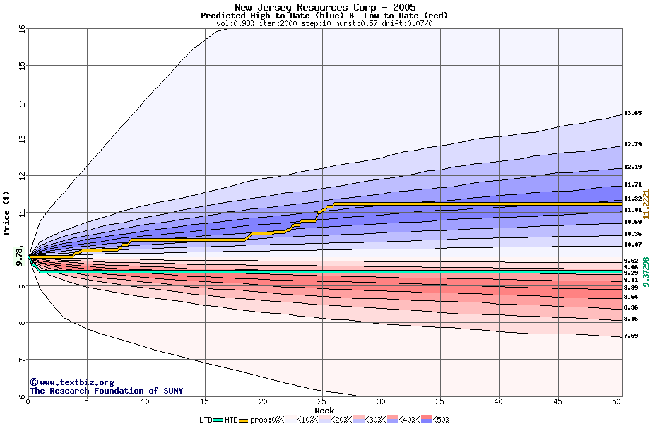 The high to date and low to date prices of the stock plotted against a random walk model for 2005 (what's this?).