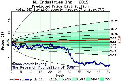 The high to date and low to date prices of the stock plotted against a random walk model for 2015 (what's this?).
