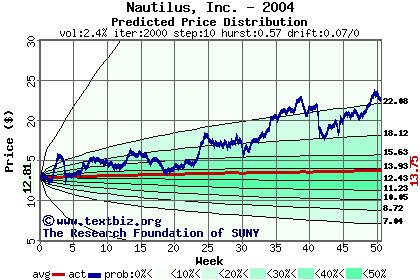 The following graph plots the year-to-date performance of the stock for 2004 compared to the probability calculated by a random walk model.