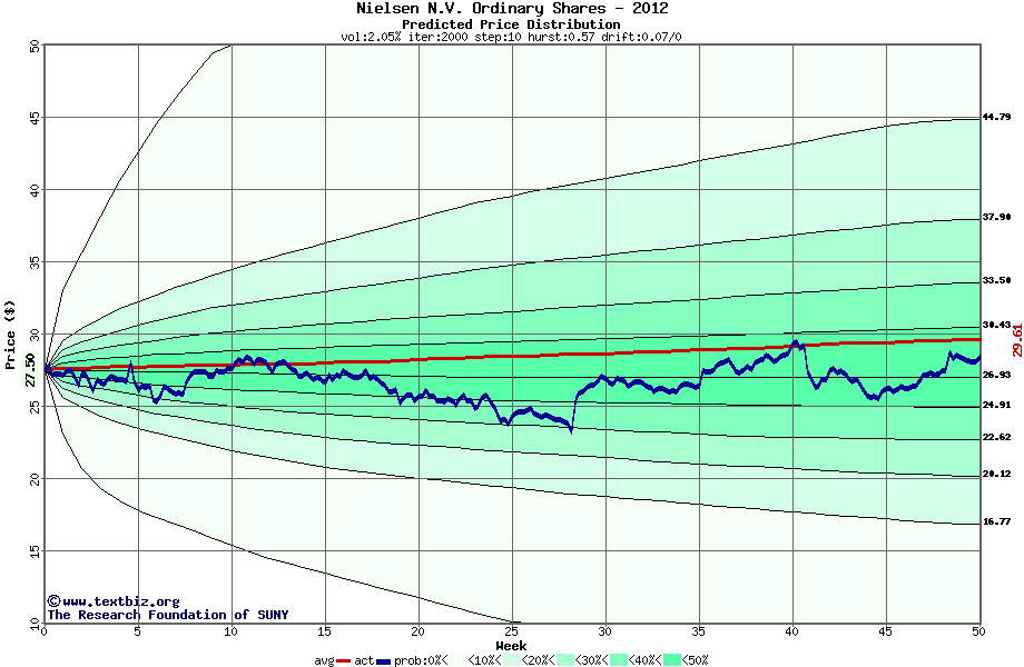 The following graph plots the year-to-date performance of the stock for 2012 compared to the probability calculated by a random walk model.