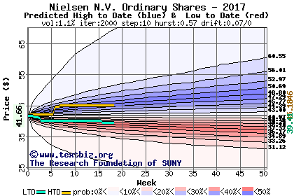 The high to date and low to date prices of the stock plotted against a random walk model for 2017 (what's this?).