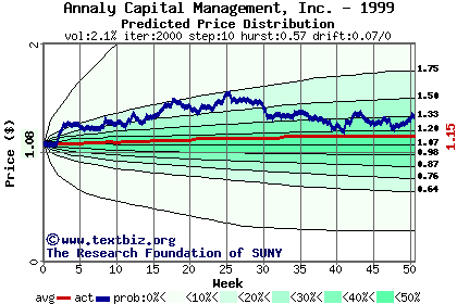 The high to date and low to date prices of the stock plotted against a random walk model for 1999 (what's this?).