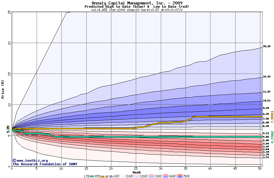 The high to date and low to date prices of the stock plotted against a random walk model for 2009 (what's this?).