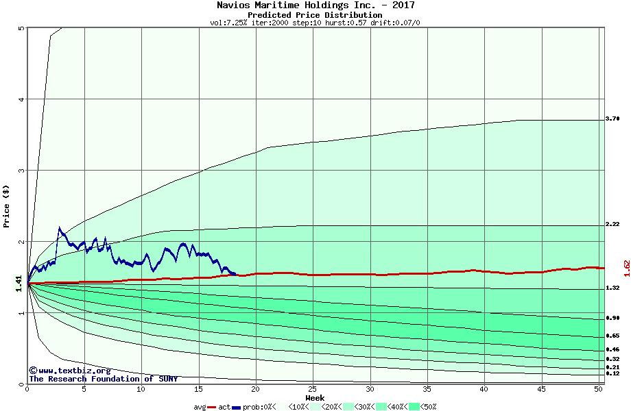 The high to date and low to date prices of the stock plotted against a random walk model for 2017 (what's this?).