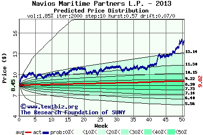 The high to date and low to date prices of the stock plotted against a random walk model for 2013 (what's this?).