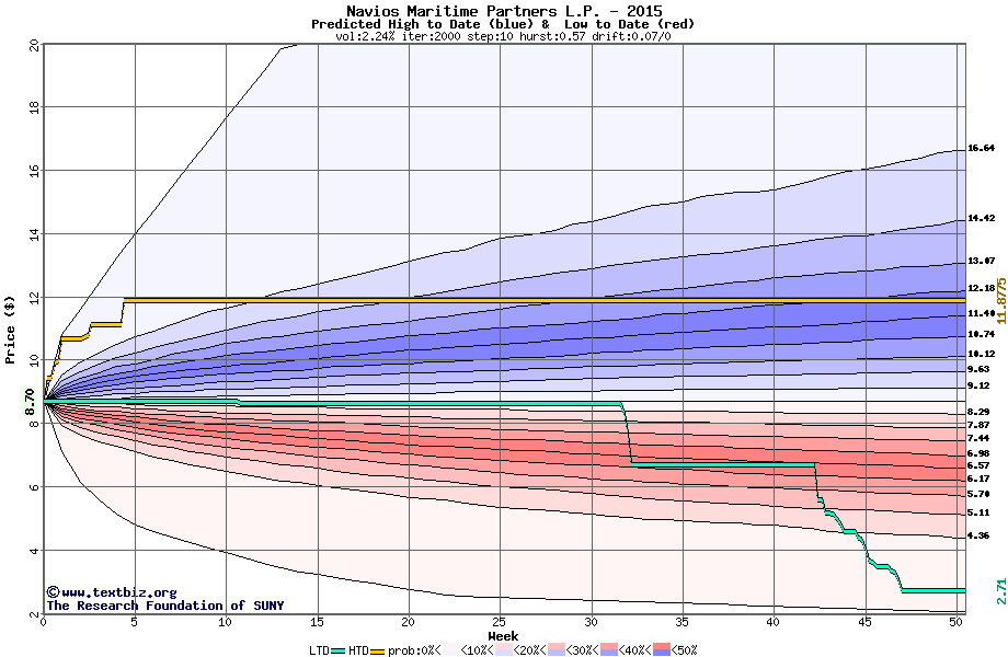 The high to date and low to date prices of the stock plotted against a random walk model for 2015 (what's this?).