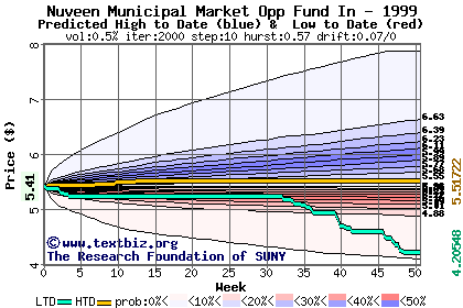 The high to date and low to date prices of the stock plotted against a random walk model for 1999 (what's this?).