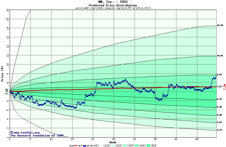 The following graph plots the year-to-date performance of the stock for 2001 compared to the probability calculated by a random walk model.