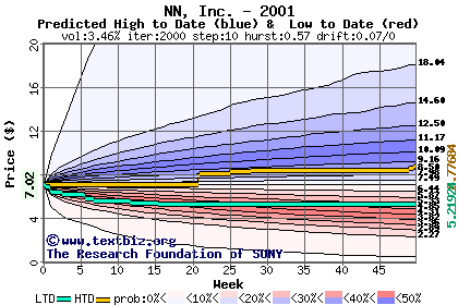 The high to date and low to date prices of the stock plotted against a random walk model for 2001 (what's this?).