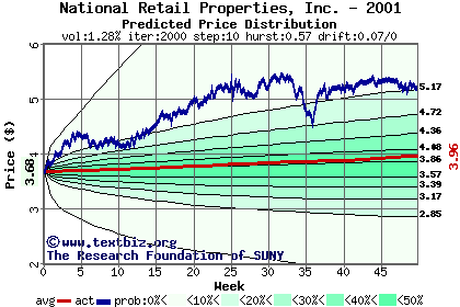 The high to date and low to date prices of the stock plotted against a random walk model for 2001 (what's this?).