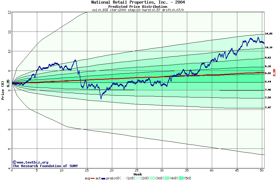 The following graph plots the year-to-date performance of the stock for 2004 compared to the probability calculated by a random walk model.
