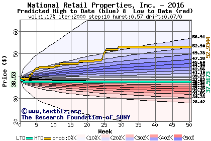 The high to date and low to date prices of the stock plotted against a random walk model for 2016 (what's this?).