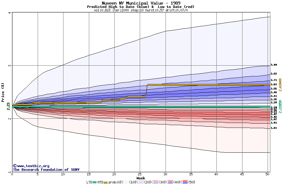 The high to date and low to date prices of the stock plotted against a random walk model for 1989 (what's this?).