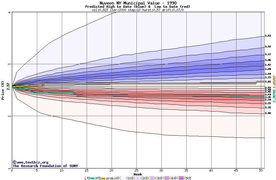 The high to date and low to date prices of the stock plotted against a random walk model for 1990 (what's this?).