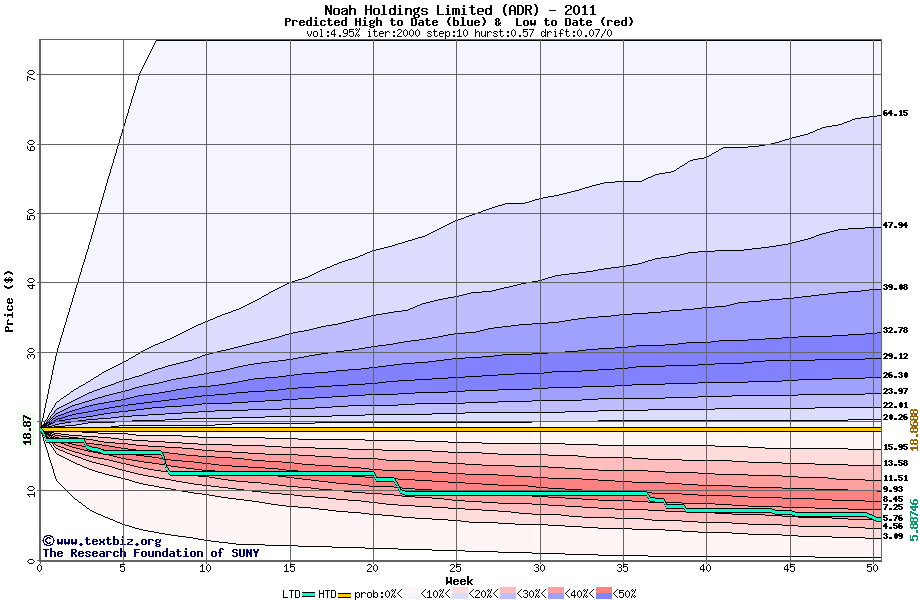 The high to date and low to date prices of the stock plotted against a random walk model for 2011 (what's this?).