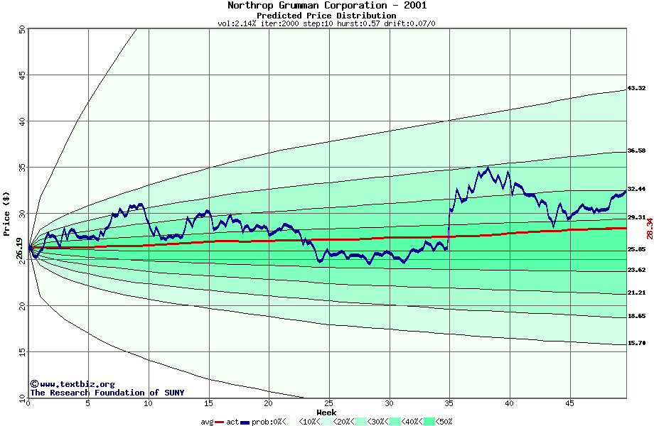 The following graph plots the year-to-date performance of the stock for 2001 compared to the probability calculated by a random walk model.