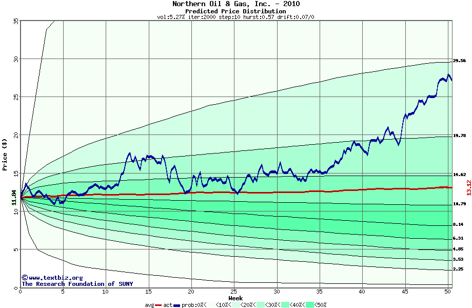 The following graph plots the year-to-date performance of the stock for 2010 compared to the probability calculated by a random walk model.