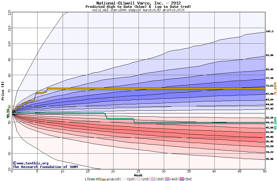 The high to date and low to date prices of the stock plotted against a random walk model for 2012 (what's this?).