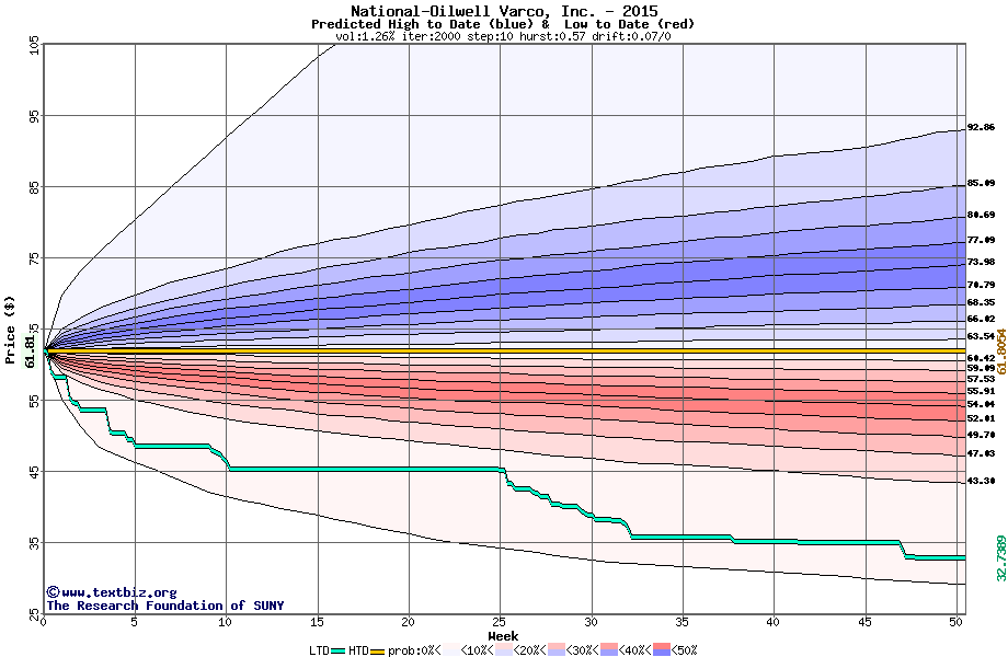 The high to date and low to date prices of the stock plotted against a random walk model for 2015 (what's this?).