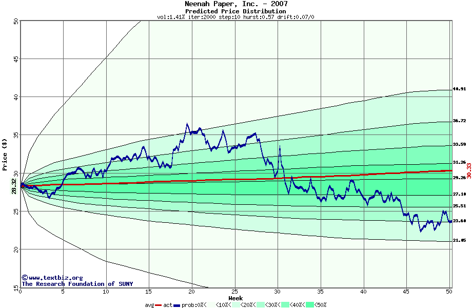 The following graph plots the year-to-date performance of the stock for 2007 compared to the probability calculated by a random walk model.