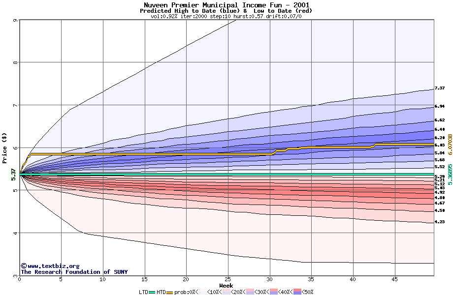 The high to date and low to date prices of the stock plotted against a random walk model for 2001 (what's this?).