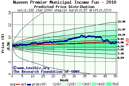 The high to date and low to date prices of the stock plotted against a random walk model for 2010 (what's this?).