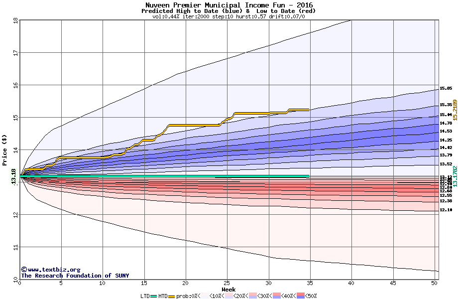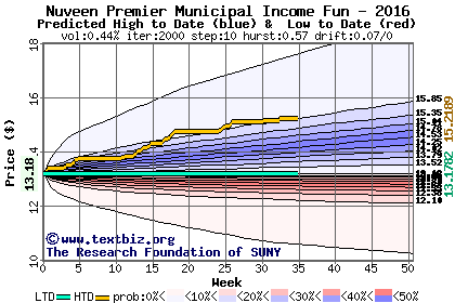 The high to date and low to date prices of the stock plotted against a random walk model for 2016 (what's this?).