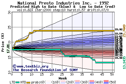 The high to date and low to date prices of the stock plotted against a random walk model for 1992 (what's this?).