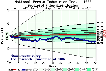 The high to date and low to date prices of the stock plotted against a random walk model for 1999 (what's this?).